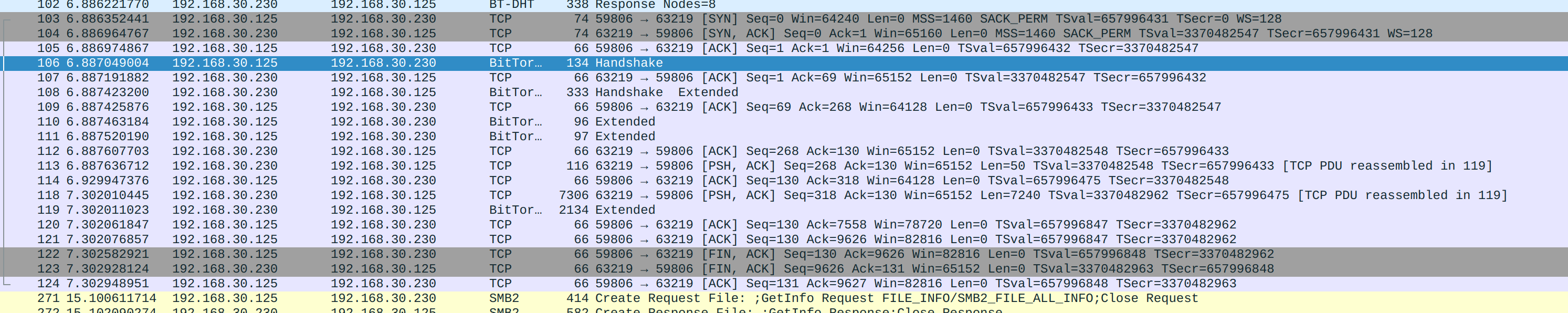 <"BitTorrent protocol"><8 reserved bytes><info_hash><peer_id_B>(B 也在reserved字节中表明自己支持 BEP-10)。 - B 发送 TCP 数据包 给 A。